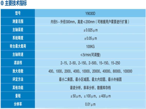 Y90D系列圓度測量儀是以大承重高精度氣浮主軸為基準,采用計算機測量系統的轉臺式通用型圓度儀,適用于大型回轉體工件的的圓度、波紋度、同軸度等參數的測量,主要應用于大型精密機械制領域。儀器主要由氣浮主軸、精密調平調心工作臺、花崗巖臺面和立柱、高精度電感測頭、精密旋轉編碼器、驅動控制電箱、高精度測量電箱、空氣過濾干燥系統以及基于windows XP的專用測量分析軟件組成。